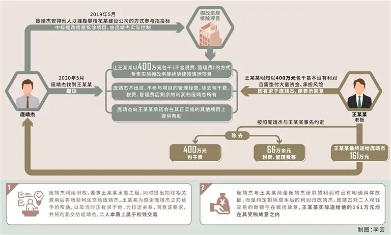 其中,2019年5月,庞靖杰在任东区住建局党组书记、局长,东区棚改办主任期间,安排老板峗某某以挂靠攀枝花某建设公司的方式参与东区棚改房屋拆除项目招投标,并使该公司中标了棚改房屋拆除项目,该项目由庞靖杰实际控制。2020年5月,因清运棚改房屋拆除建渣需要垫付大量资金,时任东区副区长、分管住建等部门的庞靖杰找到在东区开发房地产项目的老板王某某,让其以400万元包干(不含税费、管理费)的方式负责实施棚改房屋拆除建渣清运项目,庞靖杰不出资、不参与项目的管理经营,除去包干费、税费以及管理费后剩余的利润归庞靖杰所有,同时庞靖杰向王某某承诺,会为其正实施的其他房地产项目提供帮助。王某某知悉400万元包干价负责棚改房屋拆除建渣清运项目基本没有利润,同时还要垫付大量资金并承担风险,但因有求于庞靖杰,便同意庞靖杰的要求。经查,按照庞靖杰与王某某事先约定,除去400万元包干费以及税费、管理费等,王某某最终送给庞靖杰利润161万元。