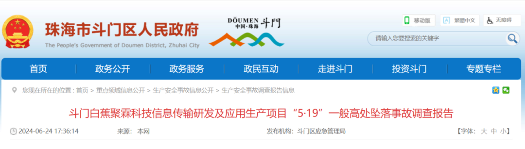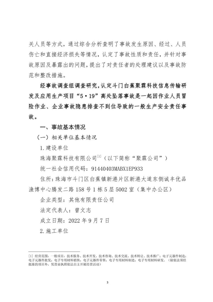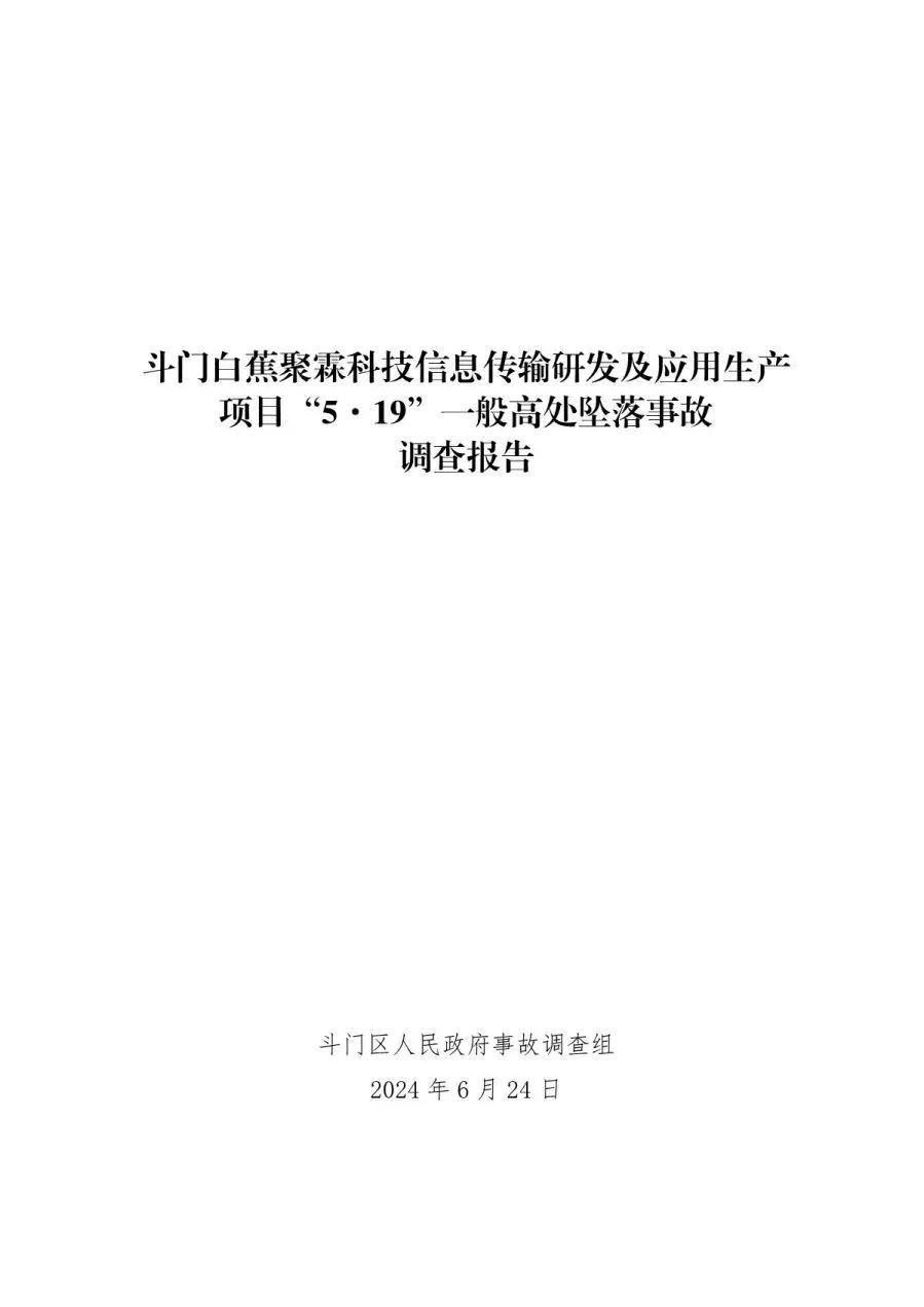 近日,珠海市斗门区市政府发布了《斗门白蕉聚霖科技信息传输研发及应用生产项目“5.19”一般高处坠落事故调查报告》。