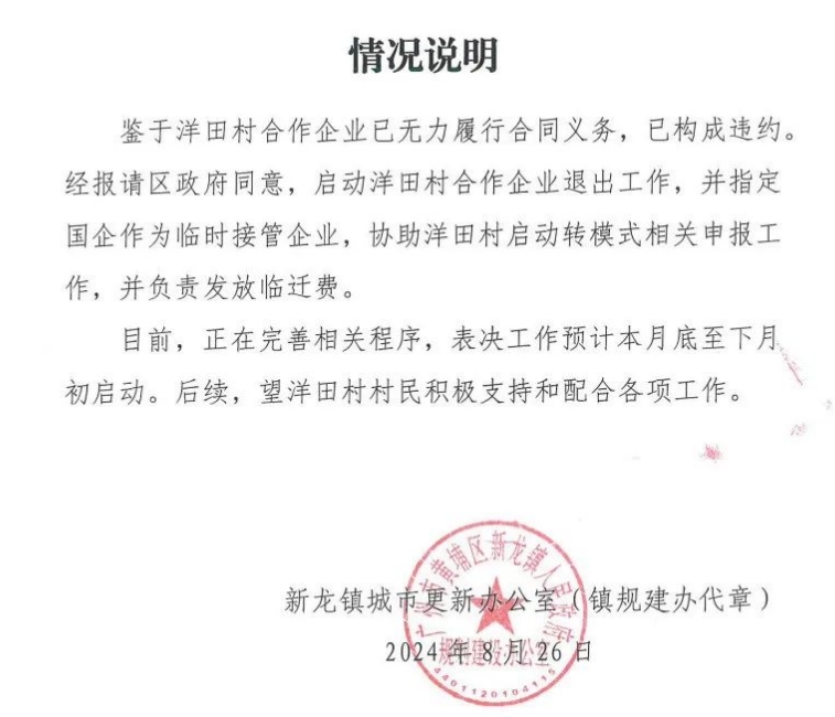 对此,很多不愿坐以待毙的旧改村开启自救之路,例如新龙镇洋田村决定踢掉改造合作企业,并指定国企作为临时接管企业;