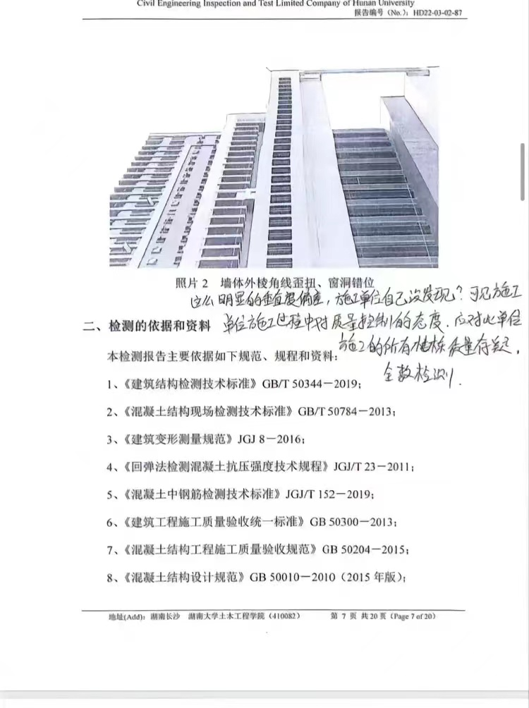 开发商表示,专业结构出具了检测报告,7号楼不是歪了,而是楼梯间的错位,并且外墙垂直偏差问题,不会影响到主体结构安全。