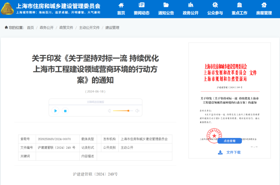 6月18日,上海市住建委印发《关于坚持对标一流持续优化上海市工程建设领域营商环境的行动方案》。