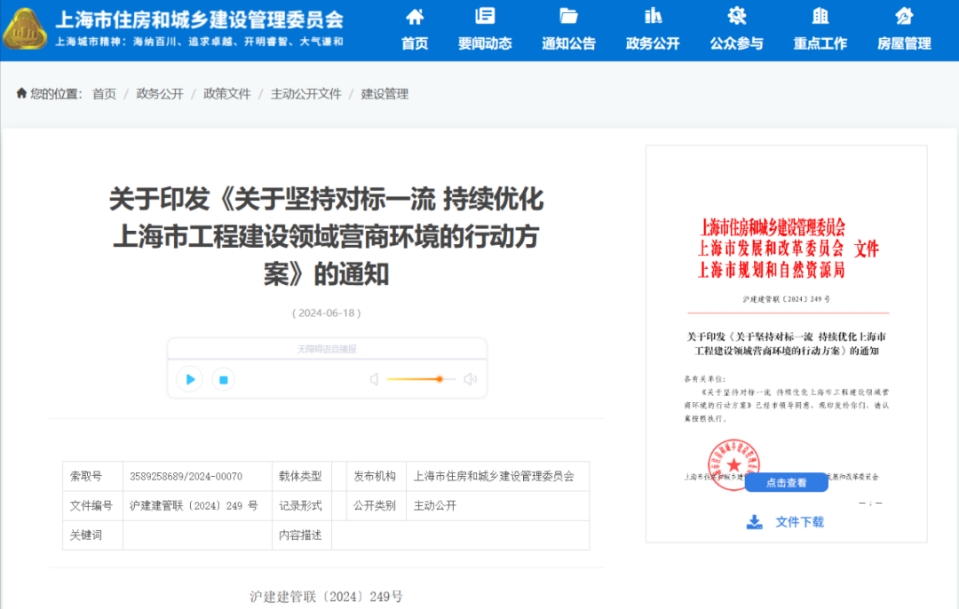 6月18日,上海市住建委印发《关于坚持对标一流 持续优化上海市工程建设领域营商环境的行动方案》。