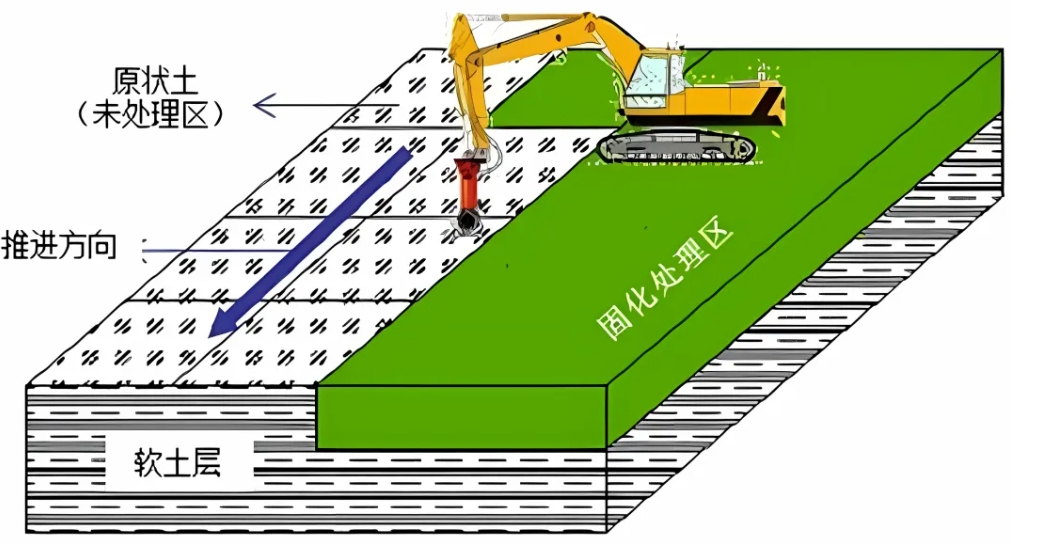 就地固化施工技术,利用软土固化剂作为胶凝材料,就地掺入地基软土或淤泥中进行搅拌,固化土壤并达到设计承载力的强度要求。