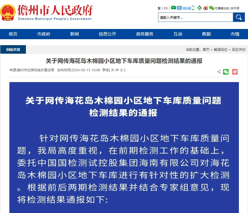 6月15日,海南省儋州市住房和城乡建设局发布《关于网传海花岛木棉园小区地下车库质量问题检测结果的通报》。通报称,未在木棉园小区地下车库墙、柱混凝土中发现使用“海砂”的情…